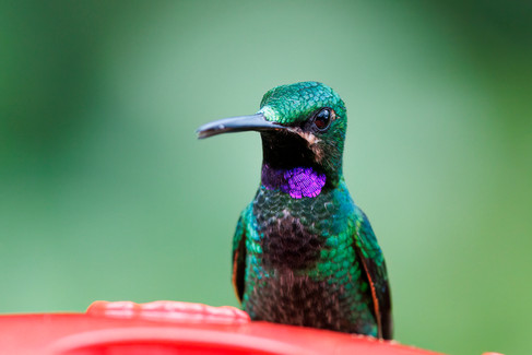 La Brisa is probably best visited in the afternoon. As the sun lowers, it moves to your back. This also means you need to get out of the shelter; as the building will cast a shadow on your subject. A bright, overcast day would probably work best, and I thought that is what we had right until we arrived, when the sun came out. We spent the first hour or so there just watching the action. Yes, I tried shooting at times, but the lighting was awful. We waited and relaxed. Then the light got better, and I did some shooting. The feeders were very active and were being quickly drained. By the time we left, two feeders had been emptied; leaving just the couple outside the shelter, which worked out just fine for us. We had: Sparkling Violetear, Lesser Violetear, Long-tailed Sylph, Bronzy Inca, Gorgeted Woodstar, Violet-fronted Brilliant, and, of course, Peruvian Rackettail. A Hourse Wren building a nest with some feathers and a bit of snakeskin and a Bananaquit rounded out species seen here. We spent a little time in broken conversation with a couple from southern Ecuador. They were hitting some of the lodges up north and doing some photography. Shooting went fairly well, and we stayed until about 5:30 PM.