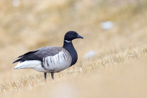 One stop for gas and an hour later, I am sitting in the parking lot of a small business located off of US 52 near Lafayette, IN. I was not sure what to expect. I heard the bird was feeding in a ditch. It is a big ditch. In the end, that did not work out too bad. It gave me a background that was not just blank white. To get on the bird's level, I had to walk down into the ditch on the other end. Anything else was pretty much shooting grass with a goose in it. The bird is on a heavy slope, but there is not much to be done about that. Anyway, here is what I got. My second Brant seen in Indiana.
