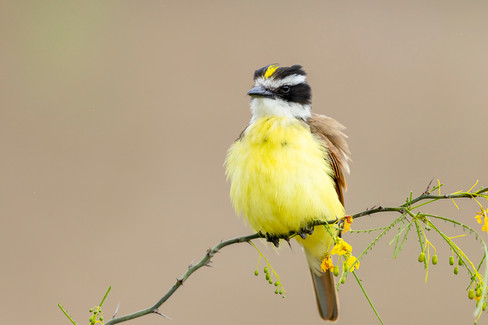 Great Kiskadee was an infrequent visitor. I kept blowing out the whites on the top of its head. We got lucky, and one of the birds went into display while sitting in front of us.