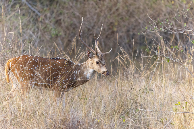 Of course, she was buried in tall grass. This would be a good quick introduction on what shooting here was going to be like. We joined a line of jeeps all jostling for position. The tiger was pretty comfortable where it was and was not leaving. Finally, a Sambar started giving an alert call nearby, and this roused her attention. She got up and walked through the grasses right toward us. Completely blocked a lot of the time. Relatively clear shots meant there was almost always a strand of grass over her face. She walked past us and then around behind the jeeps lined up behind us and disappeared across the road. Day 1 (a bonus day, even), and we had a tiger sighting! We were off to a great start.