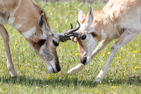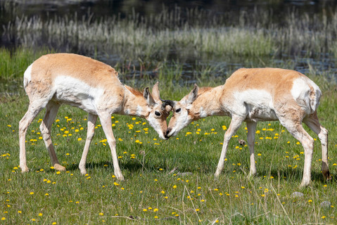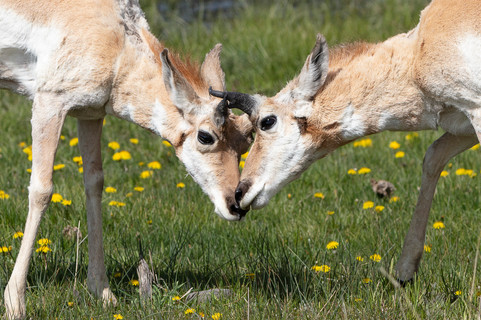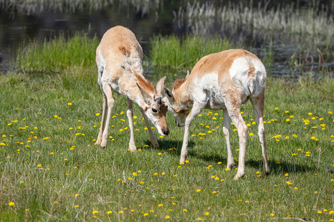 We were fortunate to witness the "Dandelion Skirmish" one day. A pair of Prongorn were peacefully grazing away on dandelions (which everything out there ate) when they decided to start sparring a bit. One finally "won" and then they both started grazing again. This, however, attracted the attention of a larger pronghorn, who then came and challenged the winner from earlier. The previous winner was quite outmatched.
