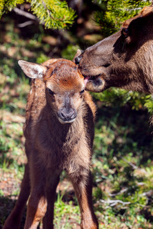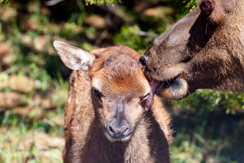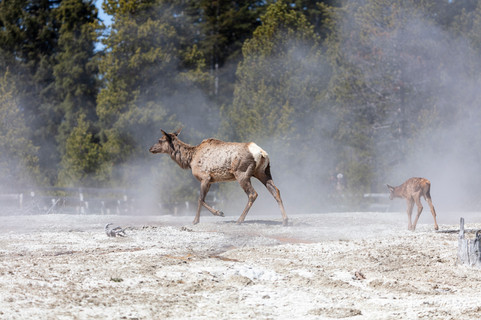 Regarding elk, we had one particularly interesting experience with a mother who led her calf up within 10' of the boardwalk. People, of course, packed right against the rail. In all honesty, she seemed okay with that. She fed; the youngster nursed. Some people were not happy with this arrangement and insisted on trying to reach out closer to the pair. Crossing the handrail got mother's attention, and it nearly got one guy a hoof to the face. She did not come all the way at him, but she snapped up and raised a hoof menacingly towards him. He corrected behavior and decided to leave shortly after that. Carmen and I hung back a bit down rail and snapped as best we could. The lighting was not the best, and there was a smoking pool of water nearby that kept sending fog across the area. I particularly enjoyed the part where mom insisted on cleaning the calf's face after a feeding. Poor little guy looked really unhappy about it.