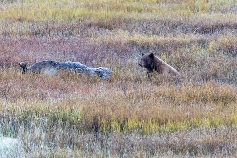 Best for last? This was a lifer for both of us. I'd seen Black Bear as a teen up in MI, and both Carmen and I saw some together in NC. Grizzly was a new experience. Our first grizzly was up in the willow flats area west of Mammoth. There, a kill had been made, and a large, lone grizzly was feeding about a quarter to half mile out. We could not see much of the bear as it wandered around in the sage. When it looked up, you could make out the bloody muzzle on the bear. It started raining, and we left; only to find out that the rain cleared later and two grizzly wandered down out of the hills to bed down there for the night. The next morning, we were there at sunrise, but they had already fed and left. Oddly, grizzly was the only bear we found on our own. Early morning out near Silver Gate, Carmen spotted a lone bear about 150 yards away from the road. We watched, and cars slowly piled up; including a tour bus. The bear wandered around feeding on grass but never got closer than about 100 years. It was a young, second-year bear. We were pretty excited that we'd found it on our own.
