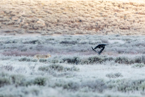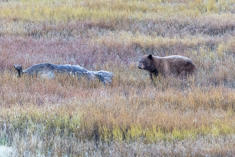 Sadly, this is also the intersection of a couple other stories from this entry and the previous blog entry. After shooting all night, we headed back to Warm Creek to take a quick nap before starting to look for wildlife. Although it was light, the sun would not rise for another hour, and it would take a little longer to peek above the surrounding mountains. We'd seen a moose here the day before. As we rounded the curve, we could see there was already a large group of photographers lined up at a pulloff. A moose (the moose we saw the day before?) had died, and a black bear was there feeding on it. We parked, and I mounted my camera to the flimsy tripod I use for night photography to hold my mirrorless camera. The tripod was hardly up to the job, but the ballhead is a RRS ballhead, and it held the weight of the large well. Still, I could have used a lot more light. I set the ISO to 6400 and did the best I could. As the sunlight creeped closer, Carmen asked when the bear was going to have had enough to eat. About 15 minutes before the sun reached the spot, Carmen got her answer - and the bear wandered off.