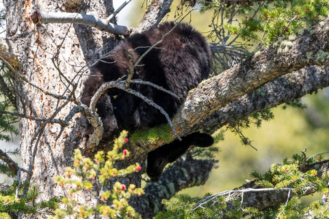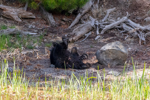 Yes, yes... the bears. We were not doing well with bears at the beginning of the trip. We did not see any in Tetons NP. We did not see any our first couple days in Yellowstone NP. It was not until we got up to the northern part of the park that our luck changed. We saw both the black and "cinnamon" colored Black Bear. One of our first encounters actually involved a set of rangers shooting one with a pellet gun to scare it off. Too close to the road and people.... On the other hand, some of our best experiences came while standing next to the volunteers that help manage things in the park. We saw several yearling bears; bears that were a year old and had been run-off by their mother to start life on their own. We had one sleeping in a tree and another one eating dandelions right next to the road. We also had one rolling in the dirt at the edge of a pond. We ran into various larger individuals throughout the far end of Lamar Valley; including a pair consisting of one black and one cinnamon. In one day, we had three sleeping in various spots along the road north of Tower Junction. Most were distant, and the lighting was usually a challenge. You take what you can get.