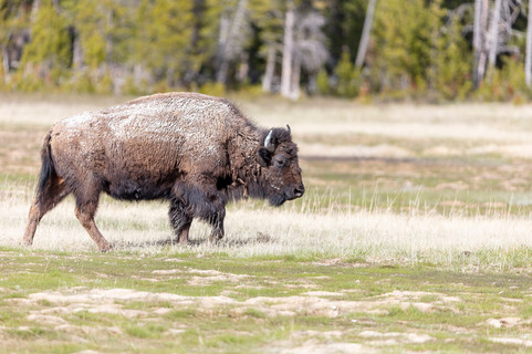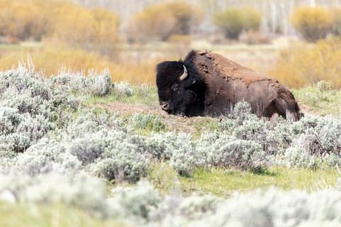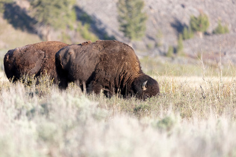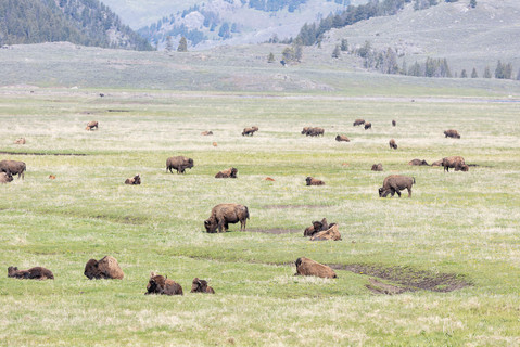 Reintroduced to Yellowstone in the '90s, Gray Wolf now roam the park, again. The "wolf people" turn out in droves to search for them every morning in Lamar Valley. Wolves occur everywhere in the park, but they are easier to find in the valley. Our first day in Lamar, we arrived and found cars lined for miles at every pulloff. We finally found a spot to park and got out to see what was going on. We'd found the wolf people, and they were really great and friendly. A guy immediately started filling us in on what was going on and insisted we look through his scope several times. We were very lucky. A pack of four wolves were slowly prowling about a mile and a half out across the valley. They were hunting bison calves. We spent quite a while watching through binocs as they walked around and positioned themselves. Then they'd spring into action as they attempted to separate a calf from the herd. The bison, for their part, would circle the calves for protection. In the end, the wolves were unsuccessful. But, it was our first time seeing a wolf, and we were quite excited about it.