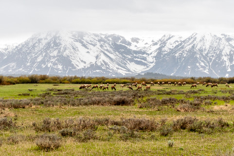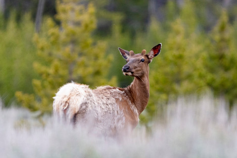 We started with some chilly and rainy days down in the Tetons. The elk down here had much larger antlers than the ones up on Yellowstone. We also had our worst-behaved tourist here. The elk were peacefully grazing and lounging until some tourist with a tiny PNS camera and ugg boots tried walking out into the field. The elk got up and moved immediately. In spite of me yelling at her and warning her that she was running the elk off, the tourist kept walking out. We were pretty much out of light anyway. We saw quite a few more elk up at the north gate of Yellowstone. The ones there attracted Brown-headed Cowbirds, and it was fun to watch them interact.