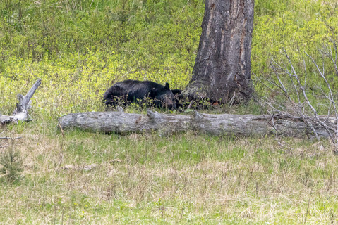 Later that day (and still nap-free), we had a mother Black Bear and two cubs crawling in a pine tree. For their size, they were quite mobile and quick. You would not escape one in a tree. They eventually crawled down and started feeding among the willows. The cubs would race around chasing each other while mom fed on the grass. It's easy to see how large traffic jams develop later in the year. Not far from Phantom Lake, we are on a bend in a two-lane road with very little shoulder. I got the car pulled all the way off the road. Others were not so considerate. Many just stopped and took cell phone pics out the window. One guy parked his motorcycle right in the road; until his wife convinced him he needed to go back and move it. Interestingly, you would occasionally have a car drive by with a heavy scent of air freshner coming from it. Each time, the mother bear would stop what she was doing and point her nose in the air. We shot here for a while (with bad lighting and sleep deprived) before finally getting back in the car and making it back to the room for a much-needed nap.