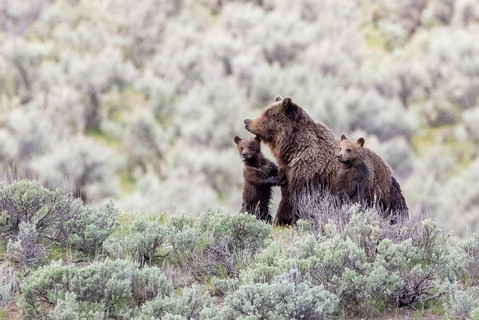 Our experiences did not end there. After running into the photo group at Warm Creek the morning after we were up doing astrophotography, we were driving back out through Lamar Valley. Shortly before Specimen Ridge, we ran into another huge line of cars that could only indicate bear. We'd seen a mother and two cubs in this area the day before. They were about 2 miles out and racing around the hill like madmen. The cubs were bolting about at speeds that were pretty unbelievable. If you think you can outrun a less-than-a-year old cub, you are wrong. Poor mom was trying to keep up and corral them. Thinking this was what was going on that morning, I suggested we drive on. Carmen said we should stop. Luckily, this brought us toward the end of the line of cars instead of the beginning. We parked and walked across the road. The two volunteers we had at another bear the day before were there, and we were pretty happy about that. They were nice. As we watched, the bears approached. Mom even stopped to nurse the young. And then they started walking closer. When they got to about a half mile out, the volunteers made people move cars to open a "window" where the bears could cross the road. I got the car parked further down the road and raced back; making sure Carmen and I positioned on the side with the sun to our backs. The bears disappeared behind a ridge and then suddenly crested one not far away. They were about 70 yards out. The volunteers moved us back a bit. Mother and cubs surveyed the line of cars and considered their options before turning and walking parallel to the road and right in front of us. The were never closer than about 70 yards, but that was okay. We watched until they disappeared behind a ridge. We ran up the road a bit to get a final look. The were outpacing us easily though. We called the experience good enough and walked back to the car. I was thinking of a nap (not realizing I had another set of mother and cubs to deal with) while others were racing to cars to get back ahead of the grizzlies.